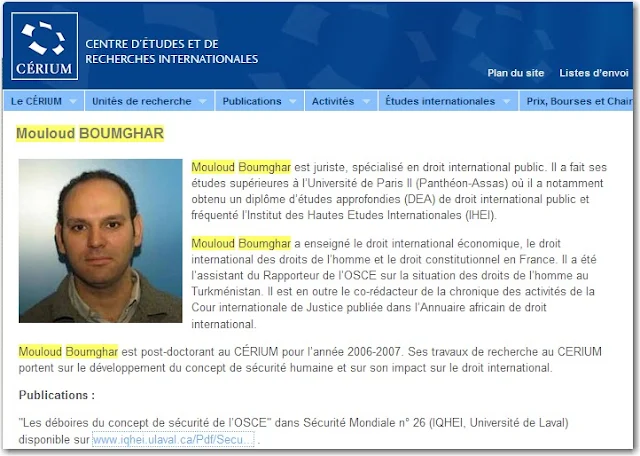 Son employeur, l'OSCE (Organisation pour la Sécurité et la Coopération en Europe), est le fer de lance de l'offensive des néo-conservateurs, depuis l'attentat israélien 9/11/2001 à NY. Le Net abonde en études dévoilant les objectifs secrets du NOM assignés à ce bras humanitaire, "une arme silencieuse" de l'offensive agressive des organisations, fondées par Soros, Brezjinsky et consorts, contre les pays ciblés par, la stratégie d'encerclement de la Russie, le pillage des ressources naturelles (pétrole), le démembrement et le morcellement géographique des nations, selon la devise ayant démontré son efficacité, du "diviser pour régner". L'amour de l'humanité qui déborde du cœur des philanthropes talmudes de New York, a submergé par son intensité l'Ex-Yougoslavie, la Géorgie, l'Irak, l'Afghanistan, les Républiques d'Asie centrales, et les pays agrippés par les étreintes amoureuses des néo-cons qui tentent de rallier les nations barbares au club des démocraties ou fameux "Axe du Bien". Pour ce qui est de notre docteur en droit international, Mouloud Boumghar, l'étendue de son savoir judiciaire l'aurait prédisposé à servir la justice au profit de son pays d'origine, en s'engageant par exemple dans des revendications légitimes, telles la reconnaissance par la France des crimes contre l'humanité commis durant le colonisation, les tentatives de génocide sous couvert d'essais nucléaires effectués à ciel ouvert dans des zones peuplées, la pratique institutionnalisée de la torture, etc... Hélas pour l'Algérie, la défense de la vérité et de la justice chez Boumghar est sacrée ("kosher" dans ce cas) seulement lorsque primée d'applaudissements, rétributions et "tapes dans le dos" de ses sponsors de Paris, Londres, et New York.