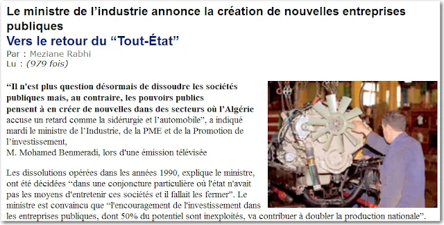 Les accidents, les guerres, les malversations, les abus de confiance, les crimes et génocides, les vaccins toxiques, sont le legs de la cupidité et de la voracité insatiable de ce monstre à visage humain . En Algérie, le secteur privé invoqué dans les litanies des T-T en gestation, aurait une vocation messianique et serait accompagné d'anges. Un vrai conte de fées, en un mot. Mais étant avertis et jusqu'à preuve du contraire, nous disons "niet" !