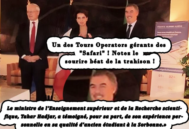 IL NE MANQUE QUE L'APPELLATION "SAFARI" AUX VISITES SUCCESSIVES DE RESPONSABLES FRANÇAIS DE L'ÉDUCATION TANT LEUR AGISSEMENTS S'APPARENTENT À UNE CHASSE AUX CERVEAUX ET DIPLÔMÉS ALGÉRIENS, DONT LES MEILLEURS PRODUITS FORMENT UNE "RÉSERVE NATURELLE" ...NON gardée, gérée PAR DES "TOURS OPÉRATEURS" SIÉGEANT AUX PLUS HAUTS RANGS HIÉRARCHIQUES DU MINISTÈRE ALGÉRIEN DE L'ÉDUCATION ET DES ÉCOLES/UNIVERSITÉS. LE RETOUR SUR INVESTISSEMENT DE CE NÉGOCE ILLÉGAL CRIMINEL EST DISTRIBUÉ AUX CERCLES MAÇONNIQUES QUI TIENNENT LE PAYS EN OTAGE ! POUR PRÉCISION, CETTE PRATIQUE criminelle afflige pratiquement tous les pays sous développés ! L'esclavage hier, le drainage de la matière grise aujourd'hui !